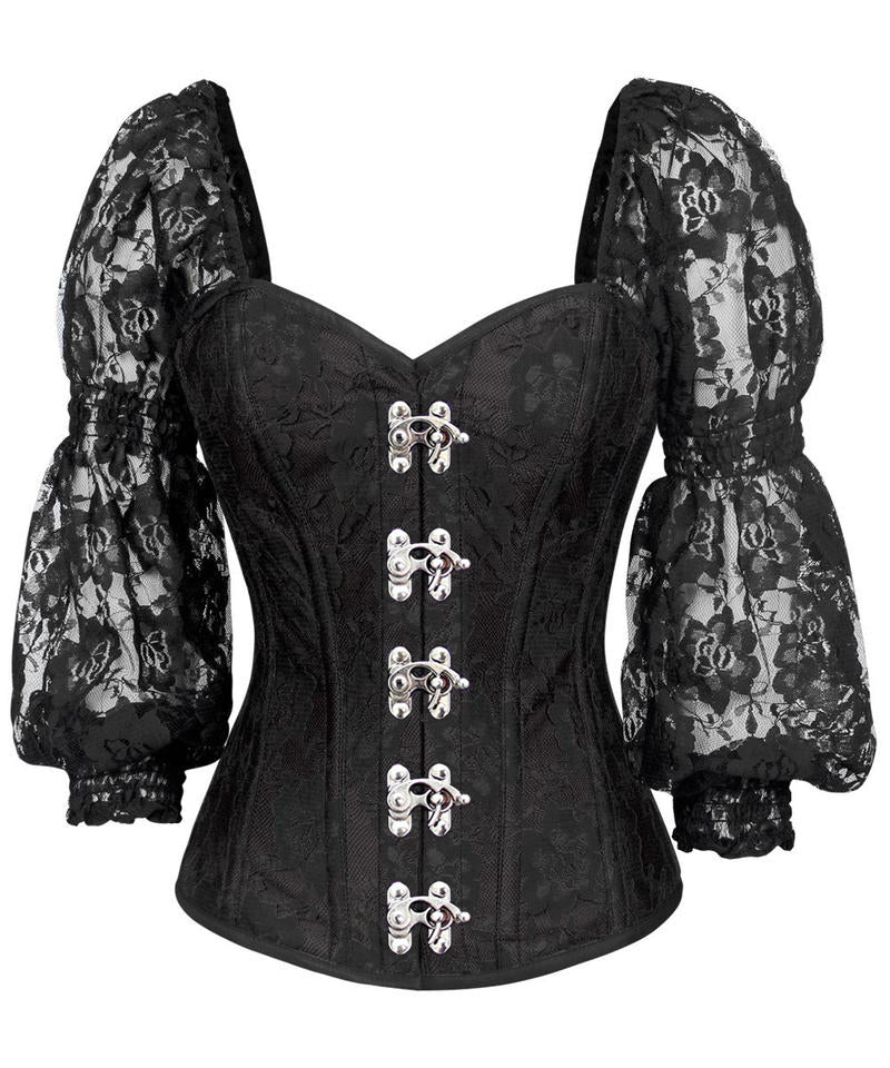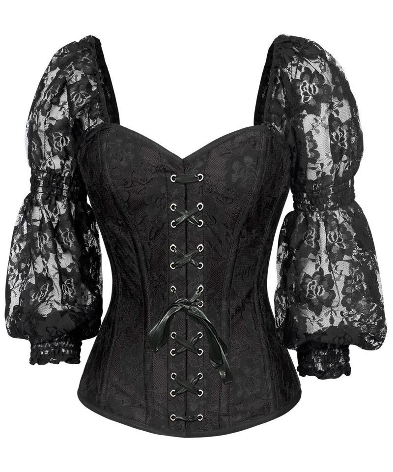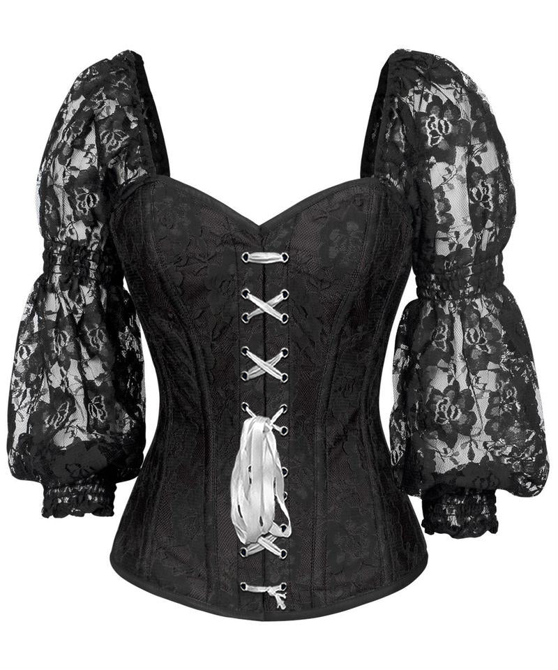 - Spiral Steel Boned Lace Overlay Overbust Corset with Attached Sleeve