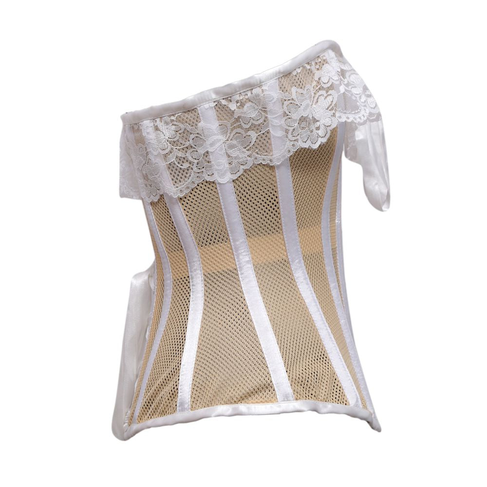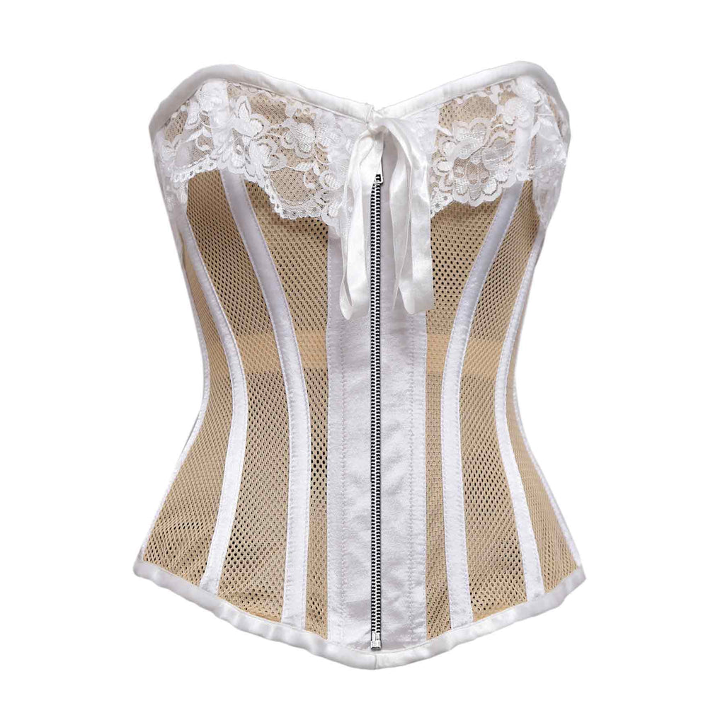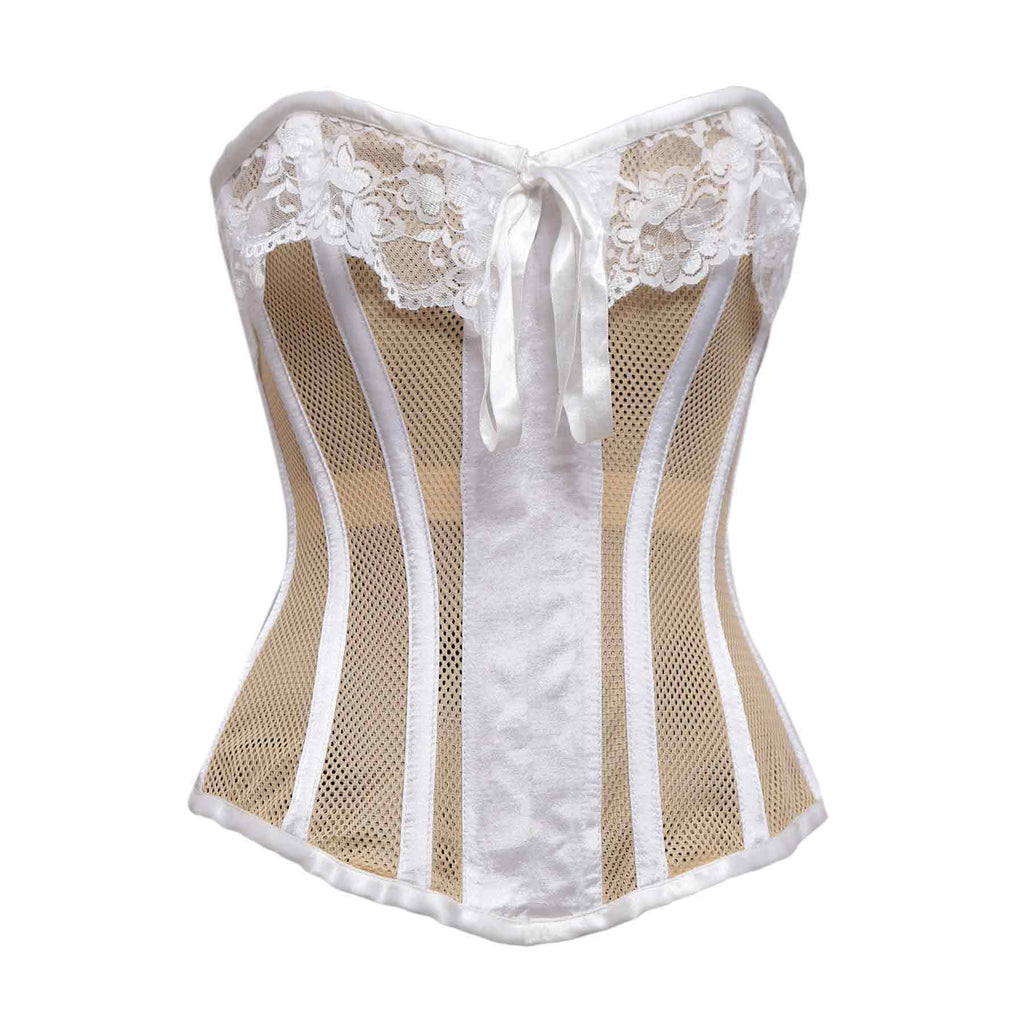 - Beige Mesh White Satin Lace Steel Boned Overbust Corset