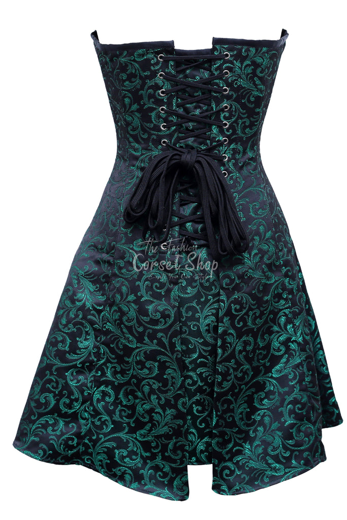 • Authentic Steel Boned Green Black Brocade Overbust Long Corset Dress