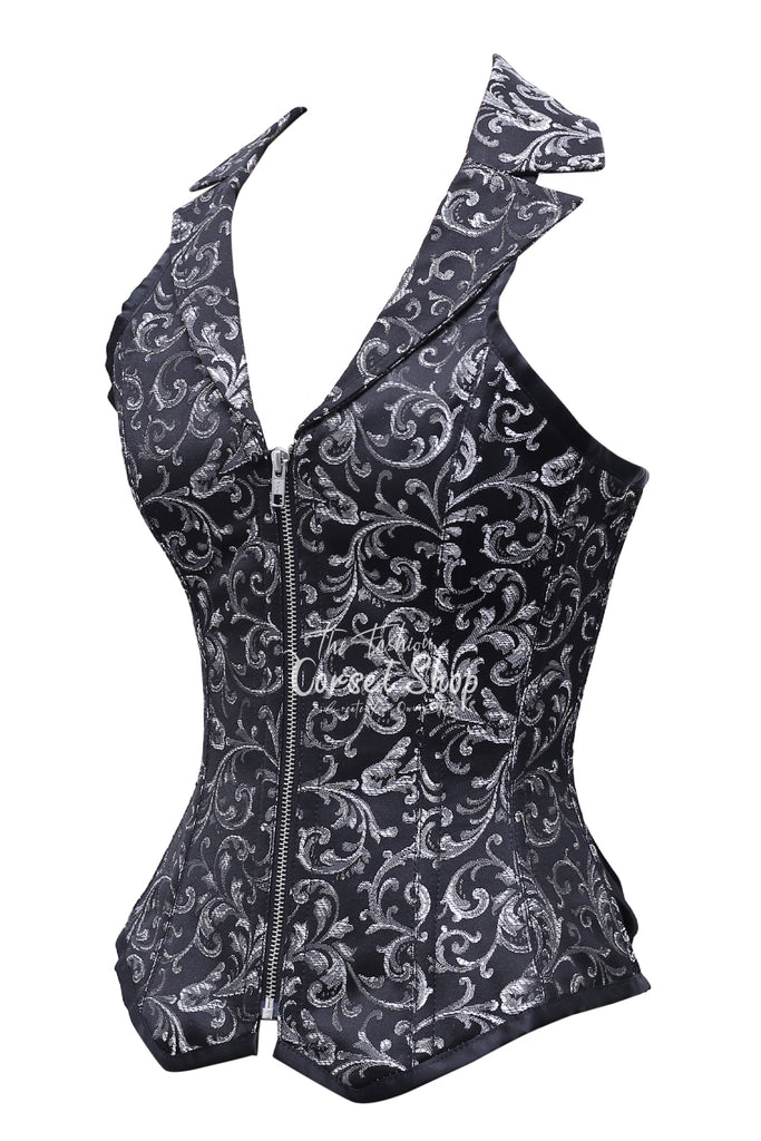 Alcock Black Silver Brocade Overbust Corset With Zip Front